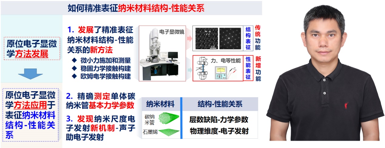 如何精准建立纳米材料的结构-性能关系是低维纳米材料研究的一个关键问题。纳米材料具有性能对结构和环境敏感、不同个体样品之间结构和性能经常不同等特点,基于不同样品、不同设备分别表征结构和性能的传统方法难以精准建立纳米材料的结构-性能关系。为此,本项目发展了一系列原位电子显微学方法,解决了如何在电子显微镜中精确表征单体纳米材料的力学、电学等物理性能的问题,实现了在同一设备环境下针对同一单体纳米材料同时表征结构和性能,提供了精准表征纳米材料结构-性能关系的新方法,并通过此方法进一步揭示了碳纳米管、石墨烯等重要纳米材料的结构-性能关系,包括:精确测定了单体碳纳米管的多个基本力学参数,建立了力学参数与结构的关系;在低维碳纳米材料中发现了声子助电子发射新机制,建立了物理维度与热电子发射的关系等。研究成果为相关纳米材料在纳米电子器件等领域的应用提供了重要结构-性能关系的支撑,共发表SCI论文80余篇,5篇代表作共被SCI他引600余次。