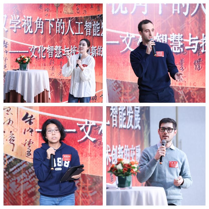 在博士生分享环节,“新汉学计划”博士生代表结合各自研究领域进行了交流。教育学院阿根廷籍博士生刘怀亚探讨了人工智能赋能国际中文教育的路径及其文化共创作用。区域与国别研究院意大利籍博士生李俊生以当今全球语境中的中国形象为切入点,分析了人工智能在新中国形象跨文化叙事中的机遇与挑战。中文系日本籍博士生船越智绘从民俗学角度分享了人工智能背景下从身体技术到数字民俗的演变。中文系意大利籍高级进修生乔影以“孙悟空”形象的跨媒介传播为案例,通过三个人工智能处理古代中国文学的实验讨论了机器能否成为汉学家。导师们对学生的研究与分享给予了高度肯定,并对案例背后的深层逻辑进行了剖析与拓展。