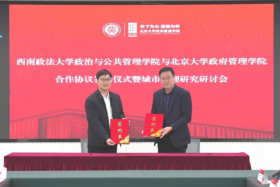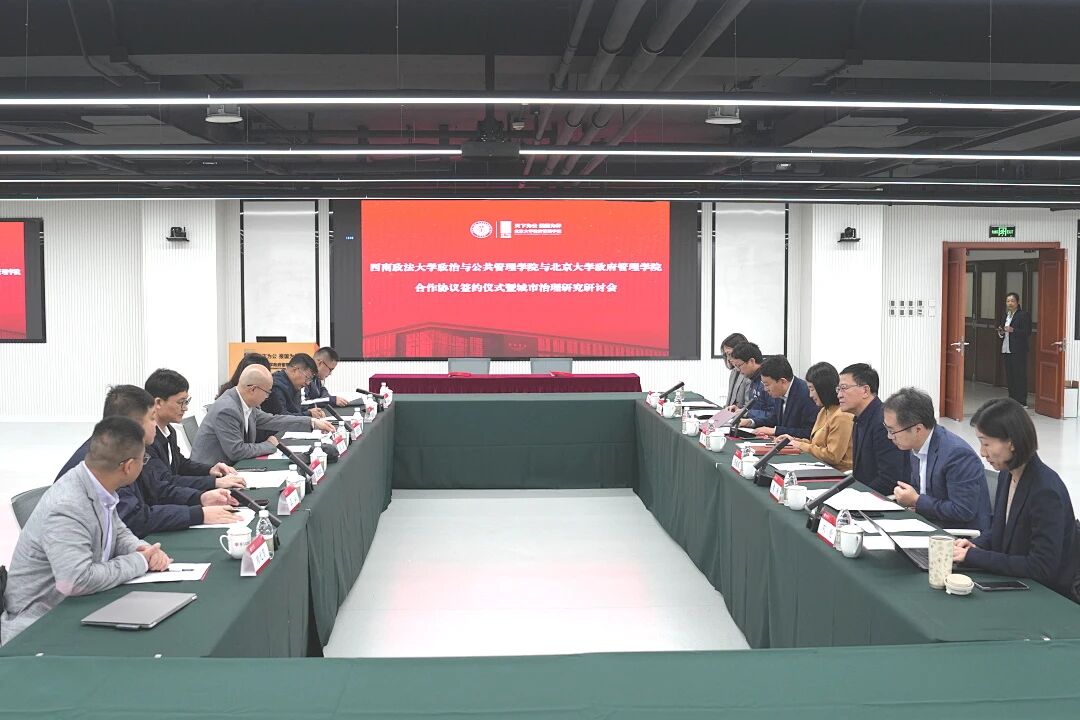 10月29日,西南政法大学科研处处长张震,政治与公共管理学院党委书记代莉平、院长曾向红一行访问北京大学政府管理学院。北大政府管理学院院长燕继荣、党委书记李杨会见西南政法大学代表团并在廖凯原楼召开座谈会,双方签署合作协议。西南政法大学政治与公共管理学院副院长、重庆城市治理与发展研究院执行院长类延村,副教授王山,教师李修科、刘元贺,北京大学社会科学部副部长郭琳,北大政府管理学院副院长、教务部副部长黄璜,长聘副教授孙铁山、刘伦,助理教授罗薇参加座谈会。座谈会由李杨主持。