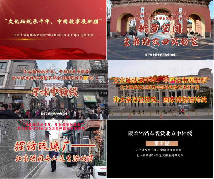 在前期学习调研的基础上,支部以主题党团日活动为抓手,组织成员奔赴中轴线点位进行参访,综合运用景观拍摄、现场讲解、人物采访等方式,5个党小组各自牵头摄制一期微党课,推动党员将传承弘扬中轴线文化做到实处。经过支部讨论与民主投票,选定“耕梦空间:皇帝的农田实验室(北京先农坛)”“寻味中轴线”“伟大征程奋进路:国家博物馆特辑”“探访琉璃厂:北京胡同与人民生活故事”“跟着铛铛车观赏北京中轴线”5个专题,走入新青年编辑部旧址、北大二院旧址、北京先农坛(古代建筑博物馆)、中法大学旧址、北大红楼、国家博物馆、大栅栏、铛铛车游览路线等地进行拍摄,积累丰富一手素材,将所学所感形成文案,让实地景观跃然屏幕,将风土人情生动记录,创作出5期微党课视频,让文化故事活起来、传得开、走得远。