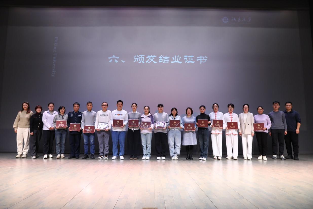 典礼结束后,结业汇报演出精彩启幕,学员与学生志愿者同台献艺、各展所长。演出形式丰富多元,舞蹈、歌曲、朗诵、小品、相声等节目轮番登场,尽显风采。舞蹈《丹心映鼓》、合唱《勘探队之歌》绽放学员阳光活力;钢琴独奏彰显个人才情,小品相声妙趣横生,歌曲婉转悦耳,武术《阴阳剑魂》尽展中华武术神韵。活动尾声,全场齐唱《燕园情》,悠扬旋律中饱含对未来的憧憬与期许。晚会落幕,全体学员与嘉宾领导登台合影,“结业快乐”的齐声欢呼铿锵有力。