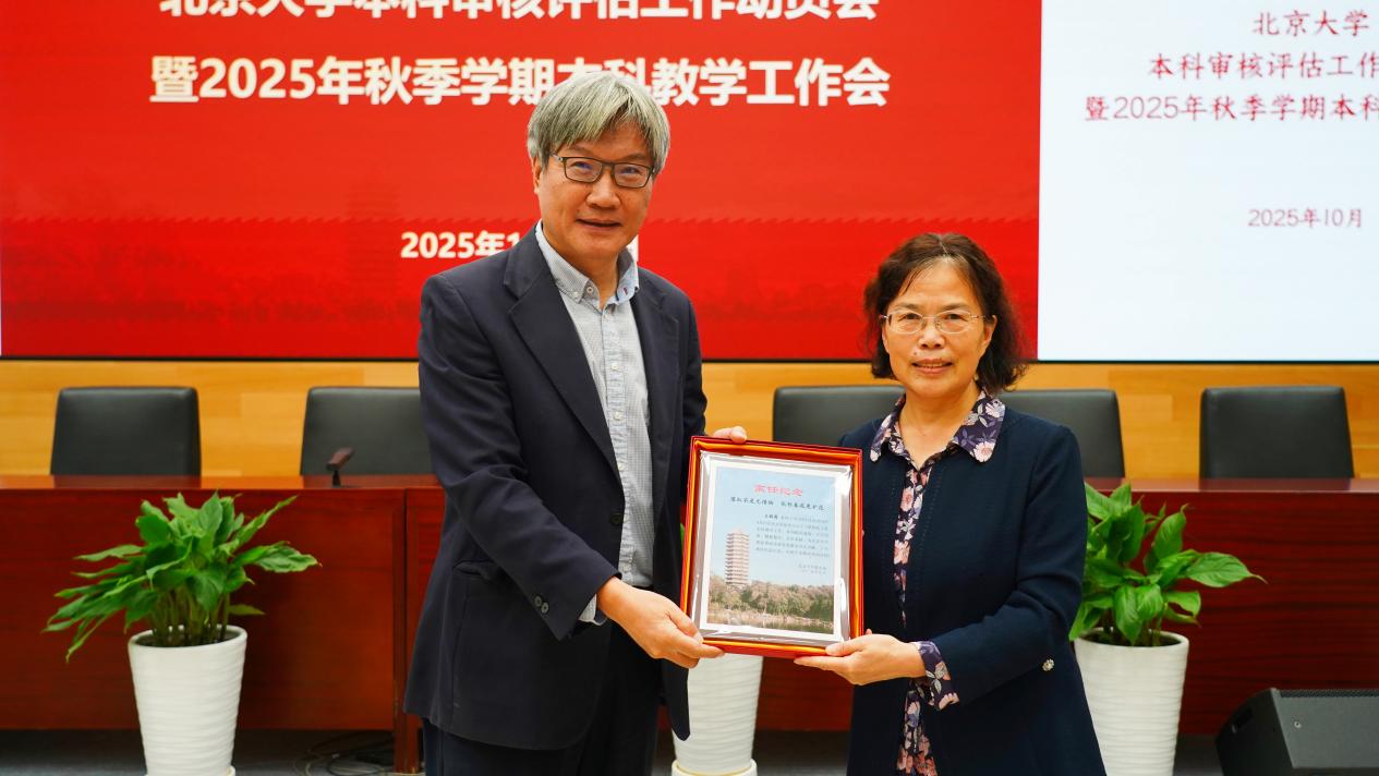 王博对本科审核评估工作进行了动员与部署。他强调,要深刻认识审核评估的国家战略意义,切实提高政治站位;要聚焦问题导向,推动北大教育教学改革再上新台阶;各单位要增强责任感和使命感,成立专项工作组,制订详细方案,确保评估任务高质量完成;要坚持以评促建、以评促改、以评促强,把审核评估成果转化为持续提升本科教育教学质量的长效机制。王博为2025年离任的教学院长代表、化学与分子工程学院前教学院长王颖霞颁发感谢牌。